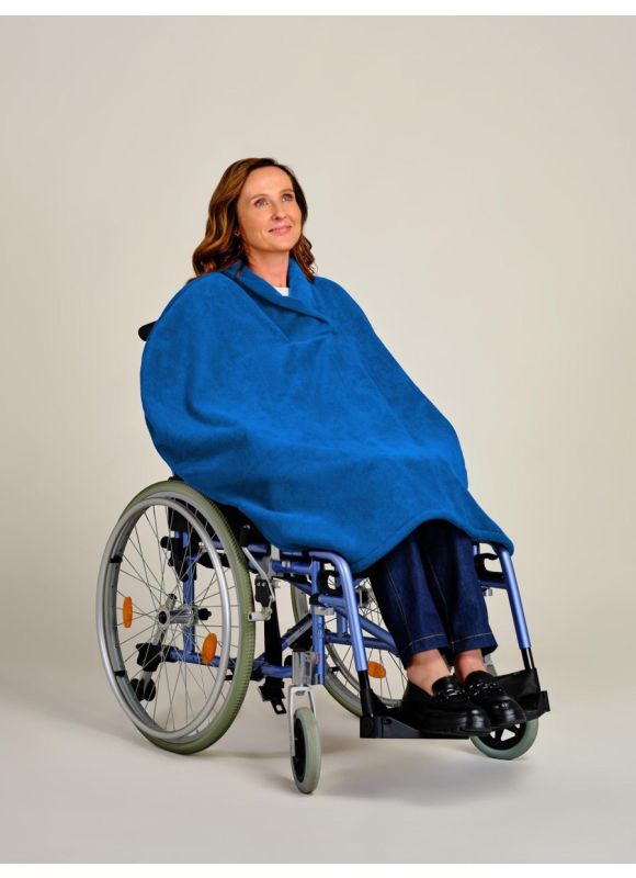 Fleece Cape, ohne Arm mit modischem Schalkragen. Die Sommerausführung ist aus einlagigem Fleece-Stoff, die Winterausführung aus zweilagigem Fleece-Stoff, in Top-Qualität gefertigt. Geeignet für Personen mit eingeschränkter Bewegungsfreiheit, Kontrakturen und Personen, die hauptsächlich sitzen.