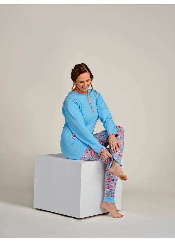 This ladies dressing jumpsuit with long sleeves and longs legs features dual zipper closure: one at the back and one at the crotch. Available in two fashionable and attractive patterns, it looks like casual pyjamas. The zipper at the crotch simplifies changing incontinence products while might preventing patient's access to them.