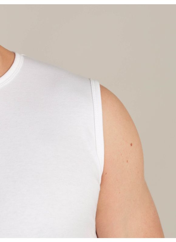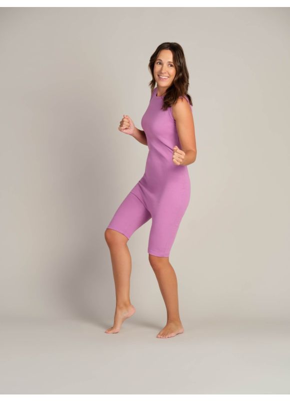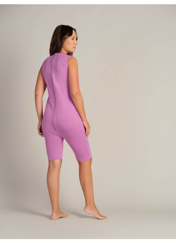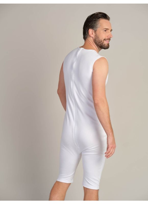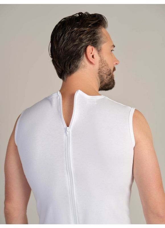 Sleeveless short leg bodysuit with back zipper closure prevents self-undressing, picking and smearing. It is made with premium quality breathable cotton that can sustain multiple-washes. The long zipper at the back prevents patient's access to incontinence products and does not pull when lying down. The crotch is reinforced.