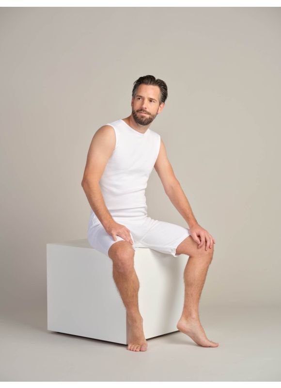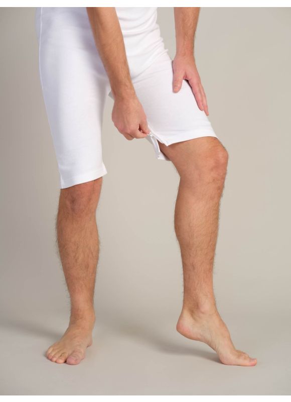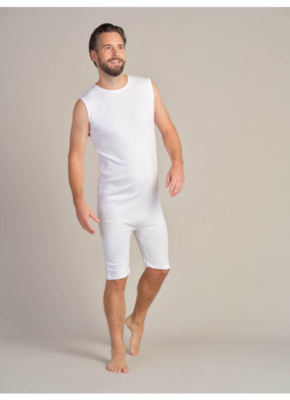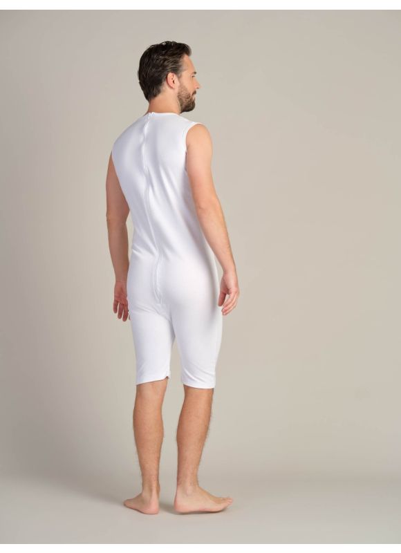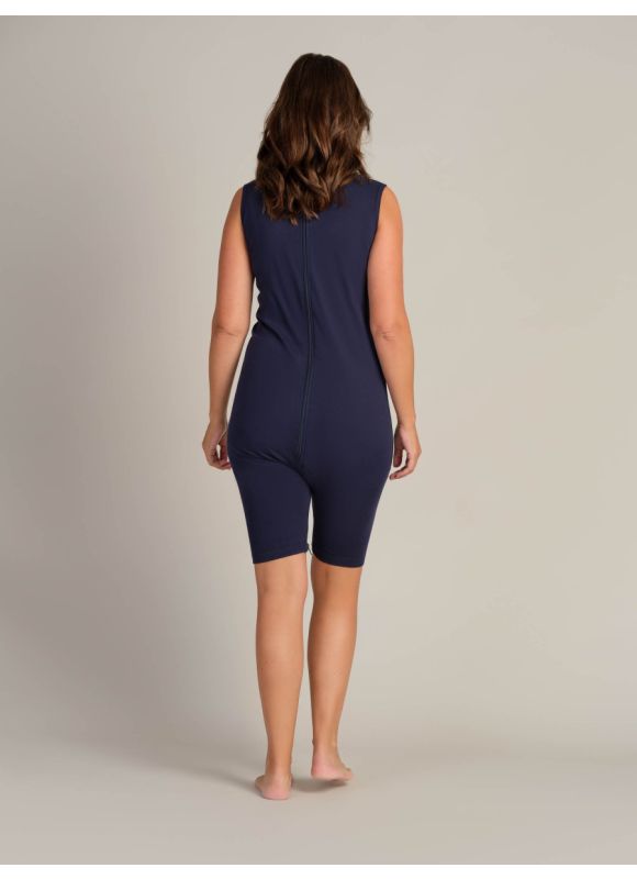 Sleeveless bodysuit with short legs and back zipper closure. It has an extra zipper stitched at the crotch to make it very easy to change diapers and incontinence products. The bodysuit can be pulled down from the head or pulled up from the legs. It is the perfect attire for dementia patients.