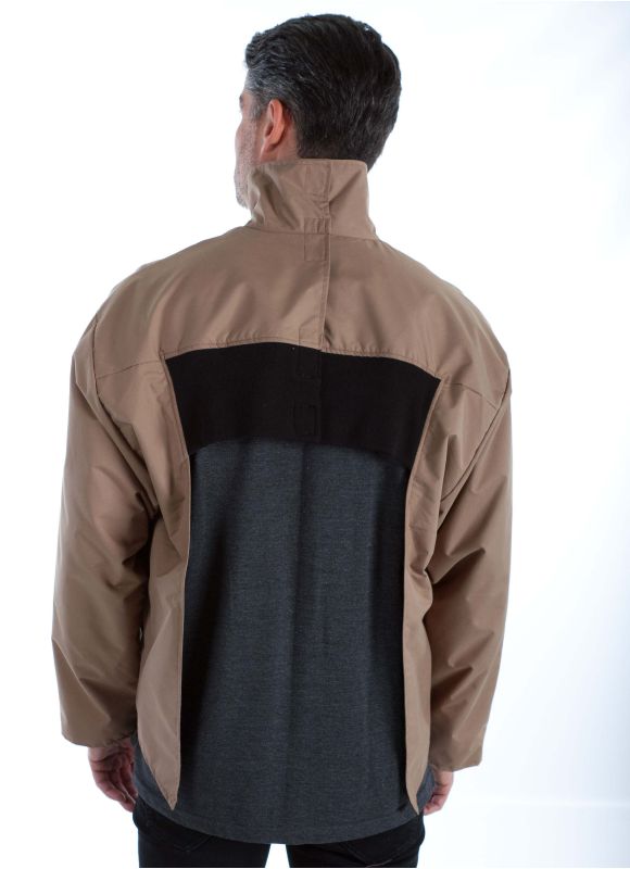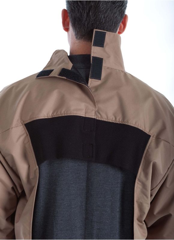Anorak winter short coat. On the front 1/3 zip coat with a Velcro turtleneck and two pockets. The sleeves are ended by inside sleeve cuff. The coat has a full back opening with a Velcro closure so it can be put on front to back eliminating the need to lift arms. It is short at the back to make it more comfortable to wear while seated. Suitable for people who suffer from restricted arm movement, contractures or who must remain seated most of the time. From the front it looks like an ordinary coat. The back can be extended with fabric or board.