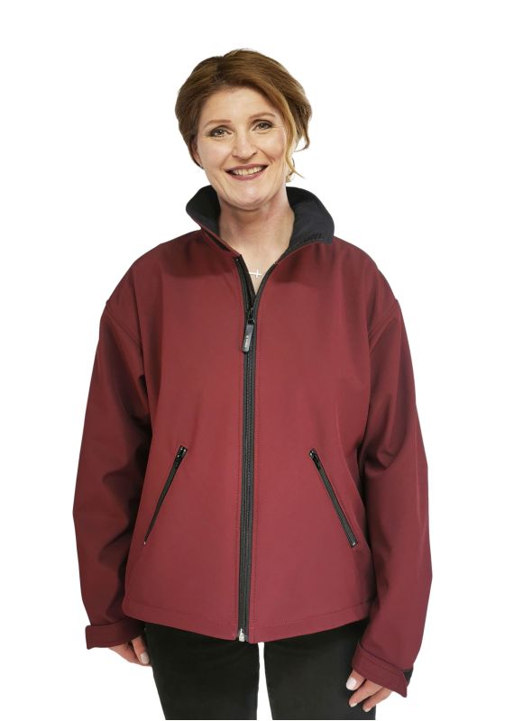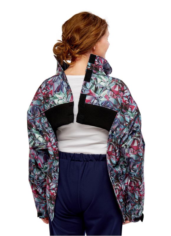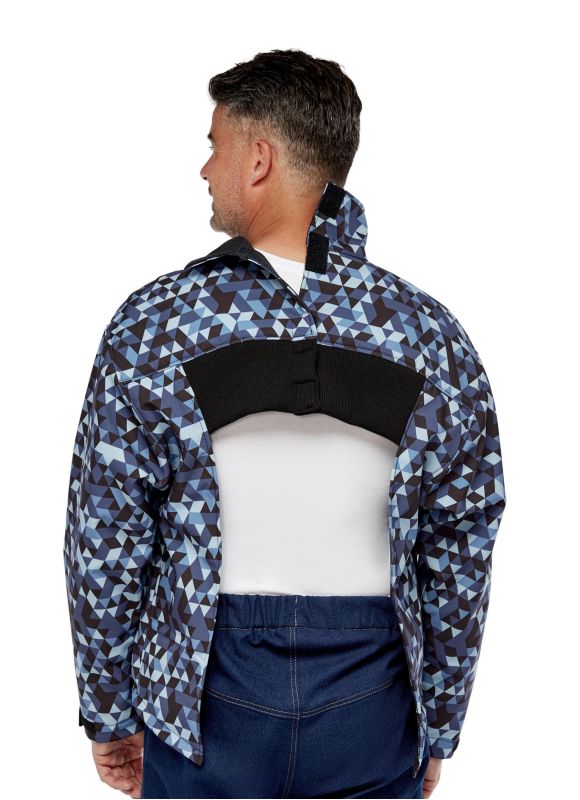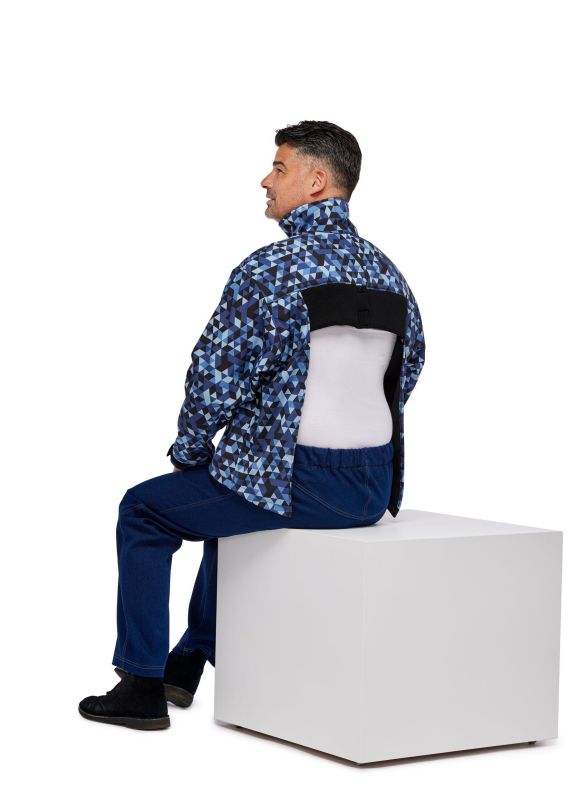 Jack winter short. On the front full zip coat with two pockets. The jack has a full back opening with Velcro closure so it can be put on front to back eliminating the need to lift arms. It is short at the back to make it more comfortable to wear while seated. Suitable for people who suffer from restricted arm movement, contractures or who must remain seated for a long time. The back can be extended with fabric or board.