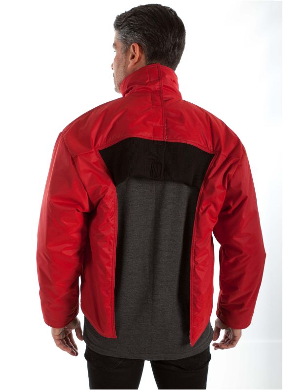 Full zip summer short coat. On the front full zip coat with a Velcro turtleneck and two pockets. The sleeves are ended by inside sleeve cuff. The coat has a full back opening with a Velcro closure so it can be put on front to back eliminating the need to lift arms. It is short at the back to make it more comfortable to wear while seated. Suitable for people who suffer from restricted arm movement, contractures or who must remain seated most of the time. The back can be extended with fabric or board.