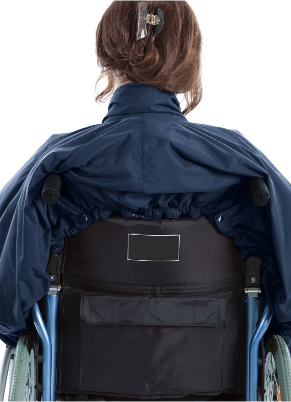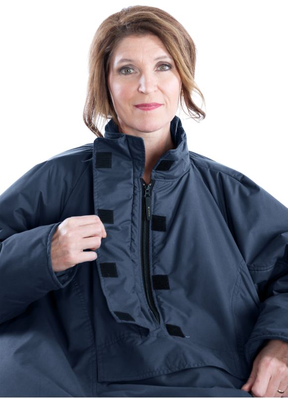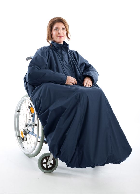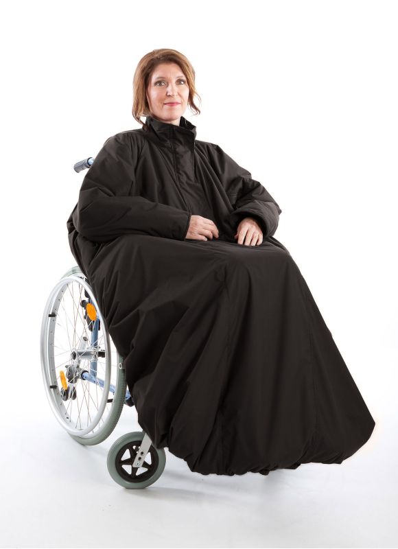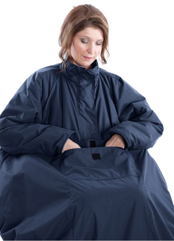 Winter cover with sleeves, completely enclosed with1/3 zip coat and Velcro strap covering the zip. At the back is a detachable hood and a button gap to strap onto the handles of the wheelchair. In front a Velcro pocket. Designed for wheelchair bound people. Perfect for winter time as it is made from thick premium quality materials