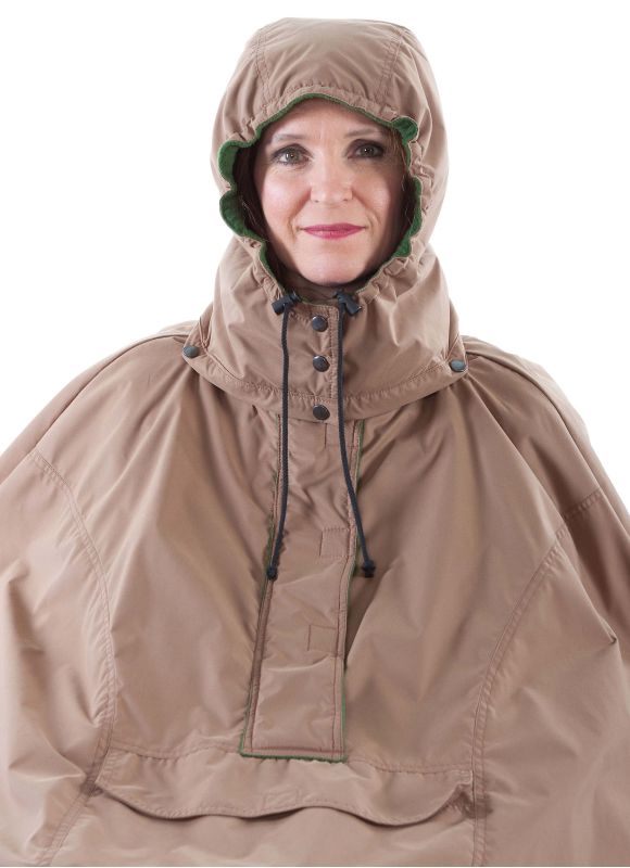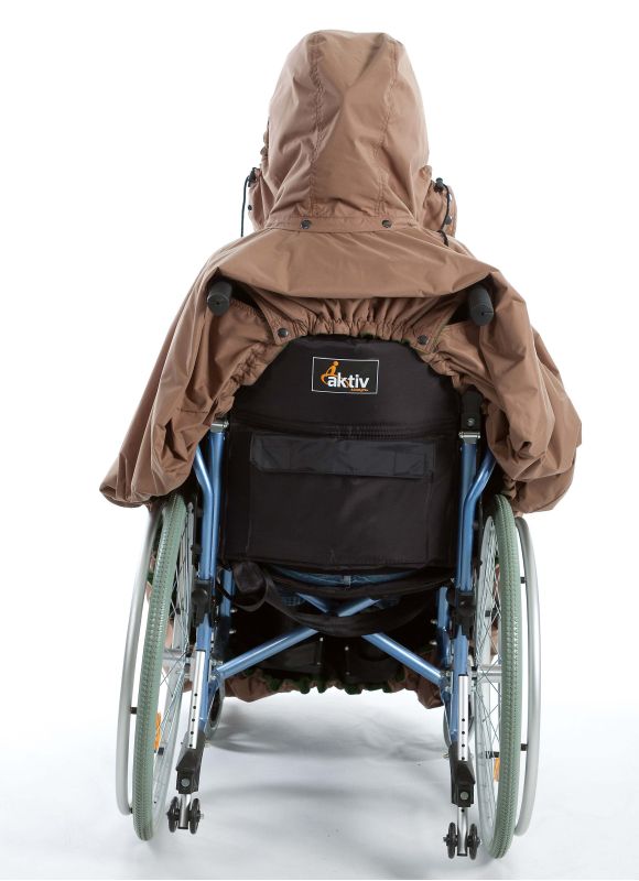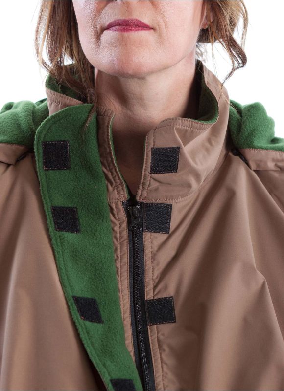 Summer cover without sleeves, completely enclosed with1/3 zip coat and Velcro strap covering the zip. At the back is a detachable hood (extra option) and a button gap to strap onto the handles of the wheelchair. In front a Velcro pocket and a bib (extra option) with buttons for people who drool. Designed for wheelchair bound people.
